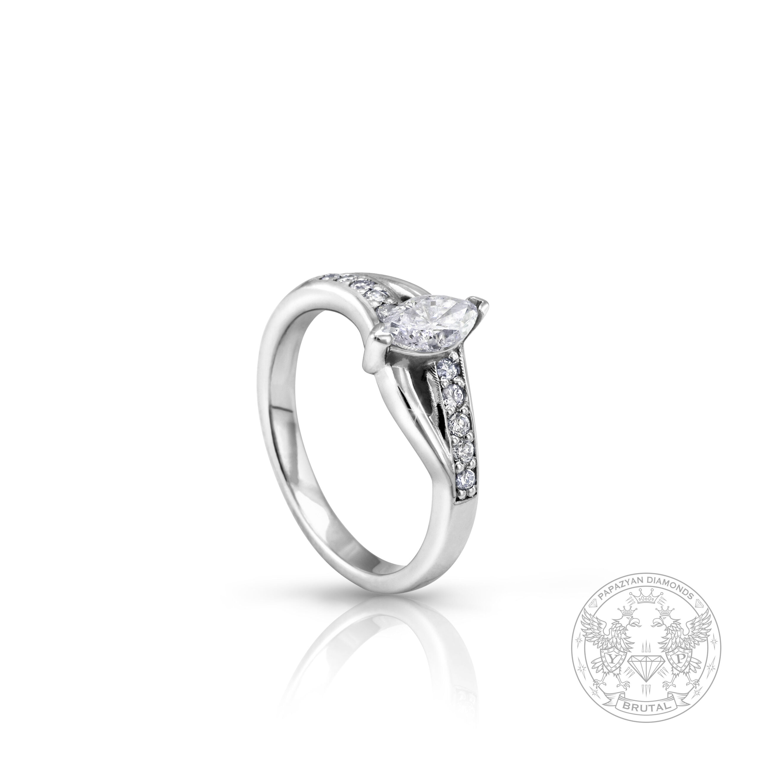 Годежен пръстен в бяло злато с централен диамант форма маркиз и странични диаманти