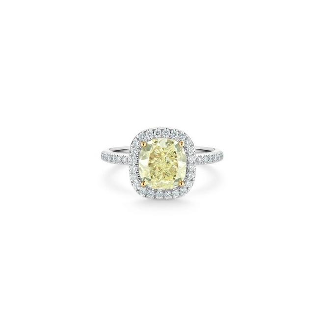 Класически дизайн годежен пръстен с акцент към изключително рядък натурално жълт диамант, придружени с международен GIA сертификат и странични висококачествени брилянти.