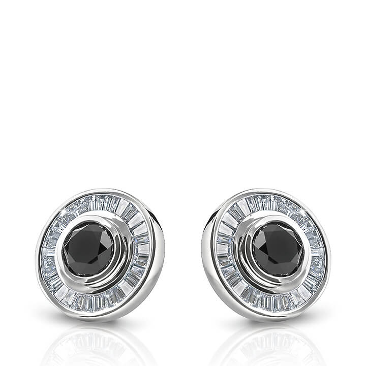 Невероятни дамски обеци, изработени от 18 каратово бяло злато с централни черни бриляти 2.95ct. и инкрустирани бели диаманти Baguette cut със сумарно тегло 1.86ct.