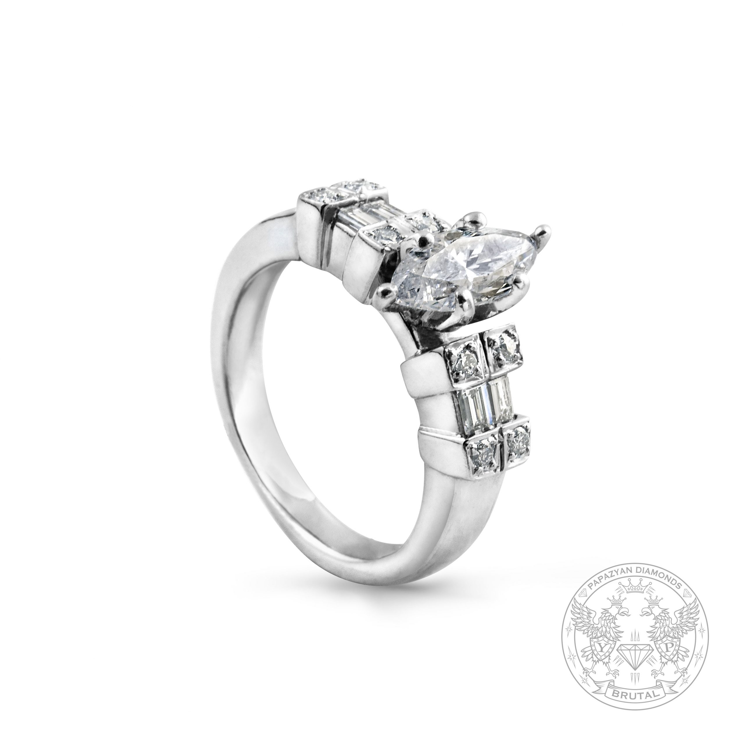 Бутиков дамски пръстен Уникат, изработен от 14К бяло злато с инкрустиран централен диамант под формата на маркиз 0.81ct. и странични диаманти 0.25ct. под форма брилянт и багета.