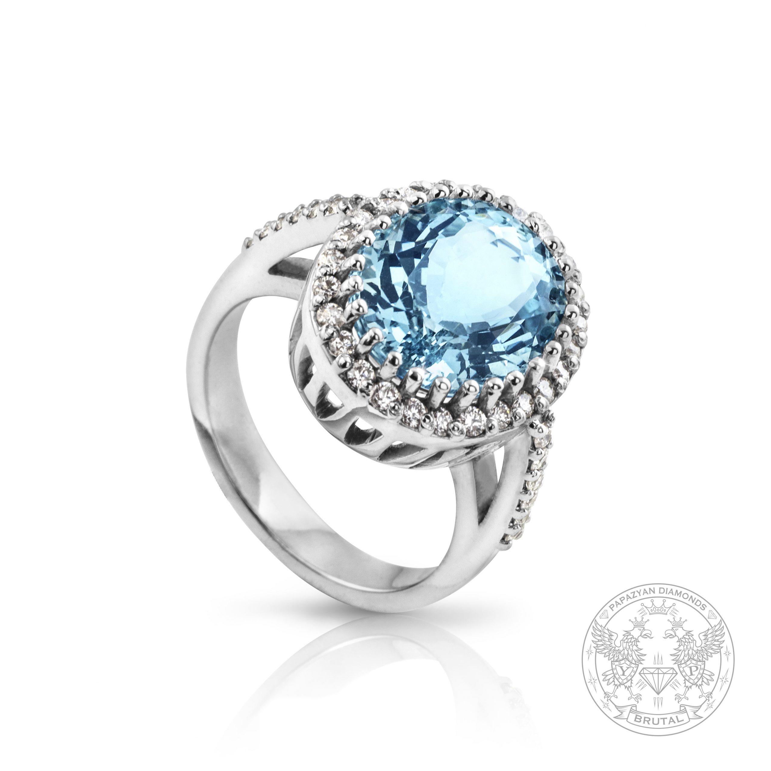 Неповторим дамски пръстен, изработен от 14 каратово бяло злато. Инкрустиран със централен съпоценен камък Аквамарин и множество странични брилянти.