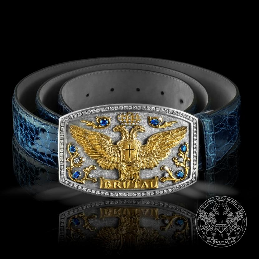 Уникален колан с тока, изработена от масивно 14К матирано бяло злато и декоративен елемент от жълто злато, 4.84 ct Брилянти и 4.50 ct тъмносини Сапфири с овална форма.