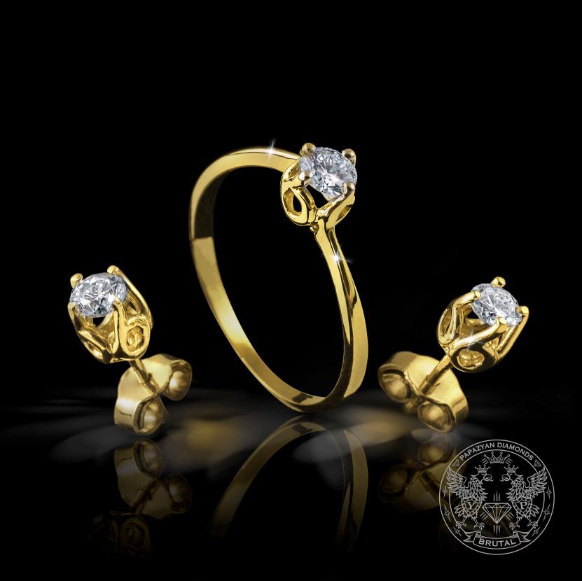 Нежен и фин комплект бижута – обеци и годежeн пръстен, изработени от 14K злато и общо 0.594 ct Брилянти.
