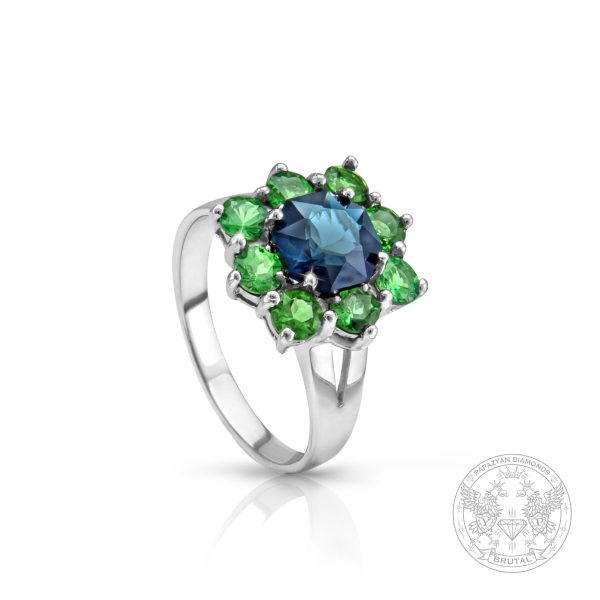 Пръстен – бяло злато с централен Индиголит и странични Цаворити BR4118