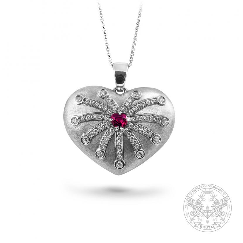 Медальонът е изработен от матирано бяло злато 14 к., инкрустиран с изключително рядък червен Шпинел с форма на сърце, заобиколен от висококачествени Брилянти.