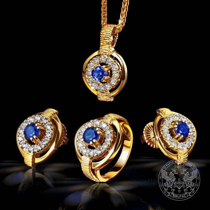Този изключително красив комплект бижута е изработен от жълто злато 14к и украсен с диаманти и танзанити. Комплектът се състои от 3 части – медальон, пръстен и обеци, стилни златни бижута, подходящи само за хора с високи изисквания.